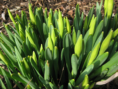 Dr. Gredler was here today to start repainting our cucumber supports (see above). These allow us to train compact cucumbers (Cucumis) upwards and many of the fruits become easier to reach under this framework. Of course Doc asked why we're bothering to paint them if they'll be buried with cucumber foliage. I mentioned that they'll look cool from April thru June out in the gardens and offer color before they are buried. I then told him to never question me again and docked his pay for the day... :) Janice was in to work on some projects and we also saw Chuck S. and Big John. Directly below are our 10 new signs that arrived yesterday from Baraboo, WI. These are a similar style and the same color as our garden area signs but these "smaller versions" will be used as labels/interpretation for our new parking lot island trees. These signs will not only include information on that tree variety but will discuss the history and implications of the Emerald ash borer (EAB) as it continues to spread and may soon become a reality in our immediate area. The signs and trees are funded thru a WI DNR Urban Forestry Grant and we're getting assistance from the Janesville Shade Tree Advisory Council as well as the City of Janesville Parks Department. We'll plant many of these new trees during our Arbor Day activities at RBG on April 27th. At the bottom is a batch of daffodils (Narcissus) that will be blooming by next week (4 weeks early). I'll be talking with the Janesville Area Herb Society tomorrow about our herb garden and will certainly recognize the help they've given over so many years in maintaining that space.