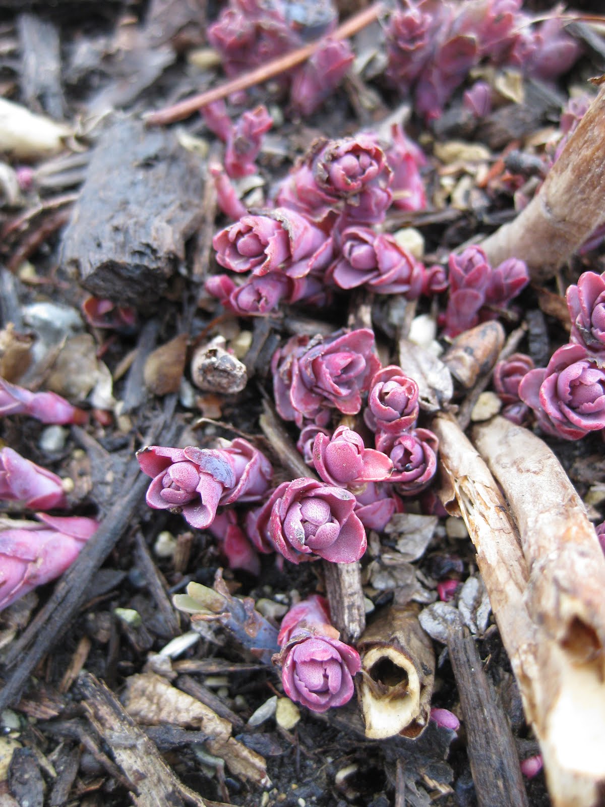 A. continued work on the new garbage/recycling bins and Del was in to work on some carpentry as well. Bill O. came in around lunch time and helped with some odds and ends. Dr. Gredler continued his painting with efforts on obelisks and Adirondack chairs. Our next project will involve the restaining of our benches (see bottom photo) although some are in more need than others. We also saw Gary and some others today. To the left is a dwarf white fir (Abies concolor 'La Veta') in the dwarf/miniature conifer section of our alpine garden. I like that shade of blue and note how most of the needles curve outwards and upwards on the stems (characteristic of most firs). The warm weather also has some perennials poking out of the ground. To the right is one of our perennial stonecrops (Sedum telephium 'Red Cauli') peaking out in this "Aprilish" weather. Hard to believe that the rest of the grounds staff (Marv, Marianne, Terry, Janice, Big John, Pat and Jenny) all start back in a month!