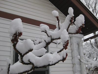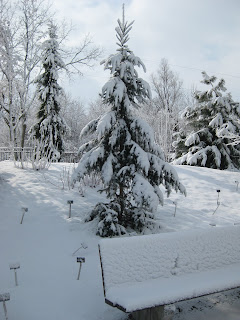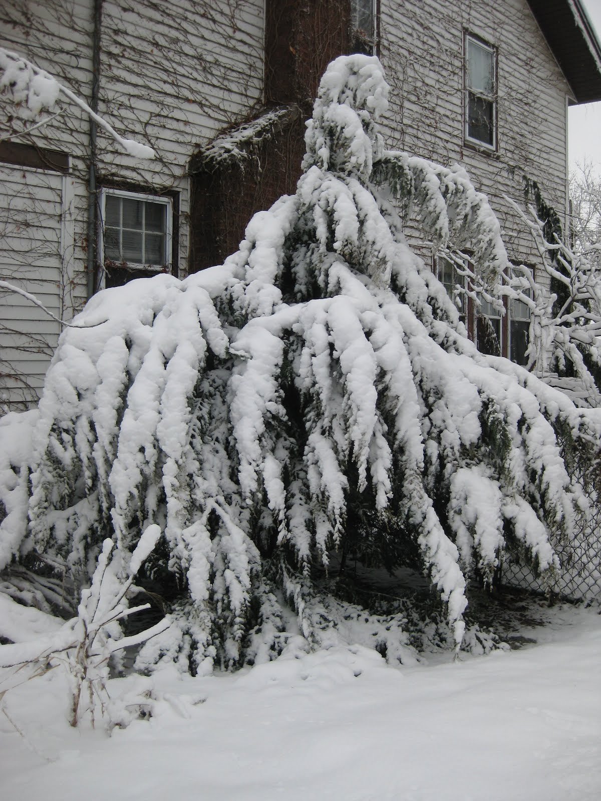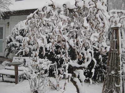 Tsuga canadensis 'Gentsch White') further down (lower left) along the side of the house. This would have been the perfect snow for our Holiday Lights Show but we'll take the moisture as it will help the gardens regardless.