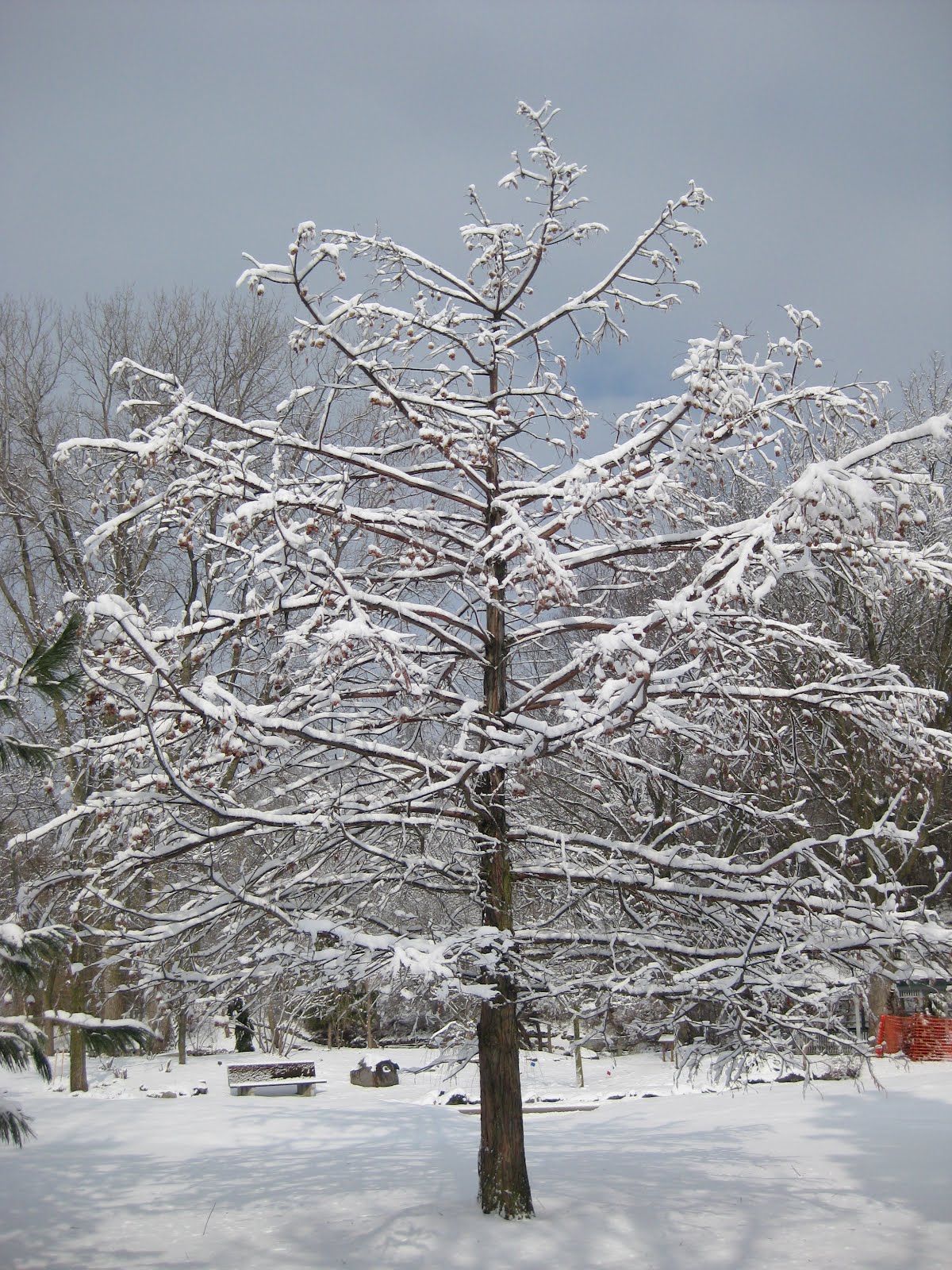 Taxodium distichum) in the arboretum and directly below are the dried fruiting structures of this deciduous conifer. To the lower right are some conifers arching down with the weight of the snow. I didn't note any broken branches from snow weight although some of mine at home were really bending downwards. Note my Canadian hemlock (