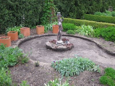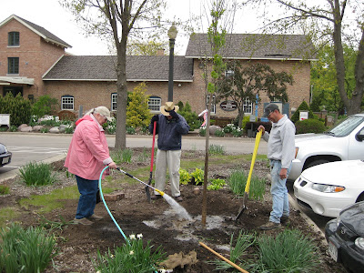 near the main parking lot. This was the eighth of ten new trees that will be planted as part of our WI DNR Urban Forestry Grant. Marv and Terry then worked on various other projects including significant air edging in the children's garden. Larry worked primarily on the sunken garden pool and fountain today with a couple of side projects. Marianne did a nice job tidying up the entrance garden, did some weed removal near the gazebo and put together her cutting display. We had plenty of other Grumpies around with Stan (pruning), Urban, Gary, Rollie, Dr. Yahr, Dave T., Jim, Maury, Dick C., Tom C. and Dr. Gredler (mowing). Luis was in to place more tree signs as well. It was a busy day, simply put. To the right is a 'Remember Me' hosta (Hosta sp.) in the English cottage garden. I love how nice hosta leaves look in spring with colorful foliage and this variety is one of my favorites. Directly below is a group of youths that came in to use our Adventure Backpack Program. They seemed to enjoy the visit although we had to remind them to keep the noise down as they were quite zealous in their explorations. At the bottom is one of the three herb garden sections that will receive a "facelift" soon with new flagstone paths (note the excavation) and new signage.