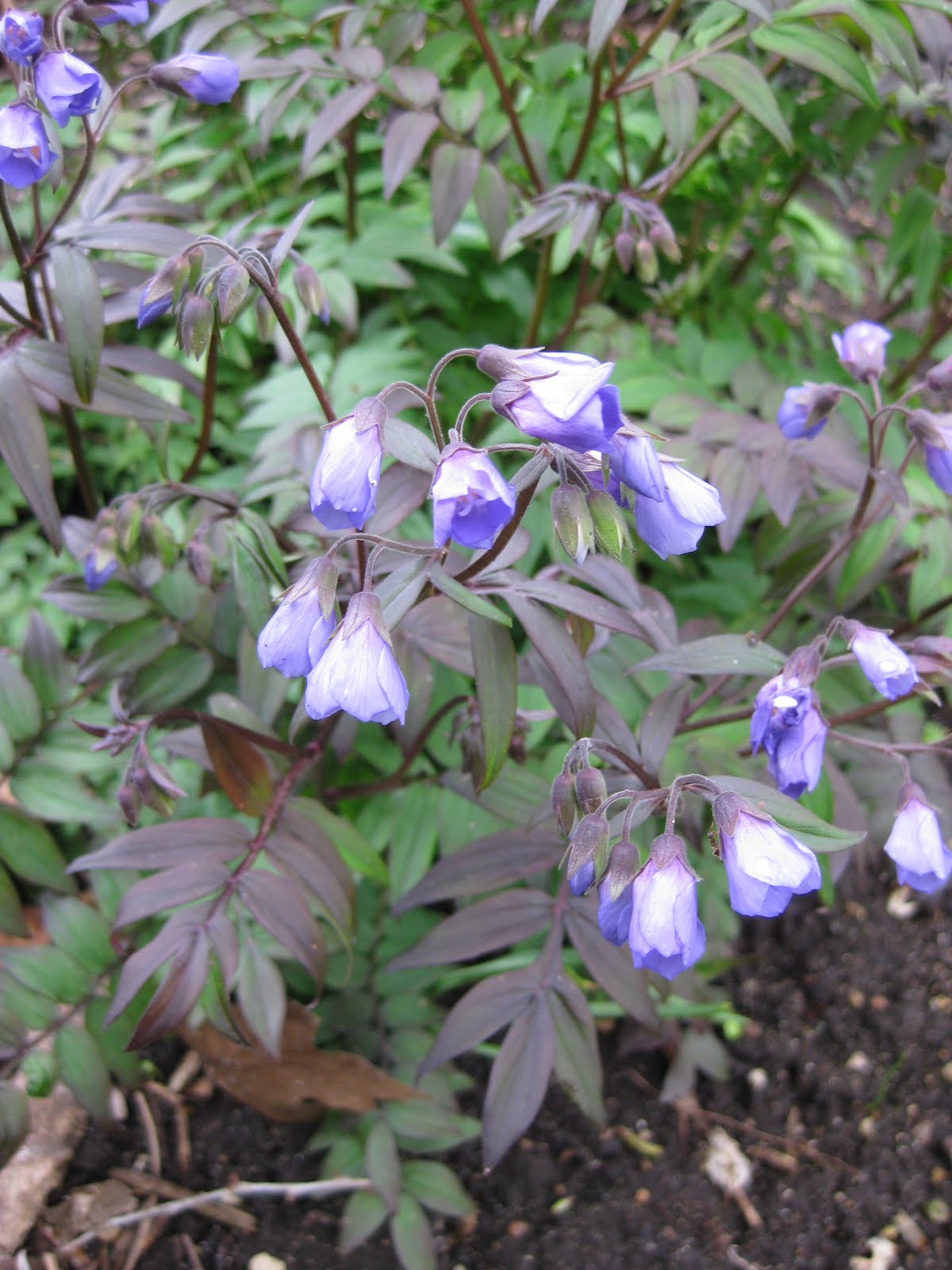 ercast all day, it was an extremely busy day, particularly in the morning. It was a great day for photographs and I do enjoy this time of year for observing fresh and vivid foliage throughout the gardens. The top photo is lady's mantle (Alchemilla mollis) holding rain drops, which I always think is neat. The photo directly above is the patterned foliage of 'Lance Corporal' knotweed (Persicaria virginiana) that has a prominent, maroon "chevron" on each leaf. This perennial is a bit of a reseeder although the late season, slender pink flowers are showy in their own right. To the right is the early dark foliage of the 'Heaven Scent' hybrid Jacob's ladder (Po