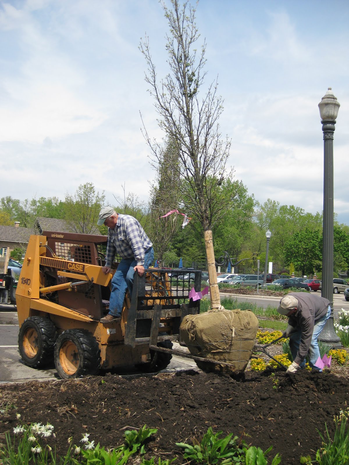 tain much of that reddish tint throughout the summer and to me, looks quite a bit different than many of the other maroon-leaf varieties (Diabolo, Summer Wine, etc.).Marv and Terry hauled three weeping willows (Salix alba 'Tristis') to an approved location across the pond from our west garden edge. This is off of our gardens proper but is viewed from across the water (North point garden, terrace garden, children's garden). Big John and Pat, after starting on installing woody plant signs, shifted over to planting these with help from Dennis and some others. They seemed to go in quite well. John and Pat later moved to some painting (back porch) while Marv and Terry planted their own tree, a Rosehill oak (Quercus robur x bicolor 'Asjes'),