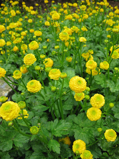 lemonium). While the leaves on this 18" tall perennial later turn to green, the spring show of blue flowers is always welcome in the partly shaded garden. To the left are the showy spring blooms of the double-flowering meadow buttercup (Ranunculus acris 'Flore Pleno') in the Scottish garden. This perennial, while a bit of creeping colonizer (particulary in wet soils), sure steals the show early in the season. This morning, Marcia and Rob from Urban Grow company (http://www.theurbangrow.com/) stopped by to do