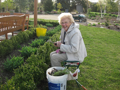 s been recently, these are the temperatures we come to expect in early April. I'm actually hoping we can get a good soaking rain soon to dampen things a bit. While it's not dry, we haven't had a lot of decent precipitation recently and April showers would be timely. The top picture shows one of our crabapples (Malus, unknown variety) in full bloom by the gazebo. We had another great volunteer turnout this morning with plenty of Grumpies and Grumpettes. Two photos above is Glenna working in the North point garden. She was joined by Janice and Suzanne this morning for a weeding tour in that garden area and the fern & moss garden. Directly above are Bev and Ron who continued hauling, placing and securing our benches out in the gardens. Both moved on later to some other projects. What a sad commentary that we have to chain e