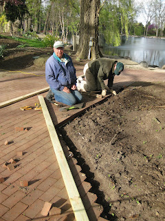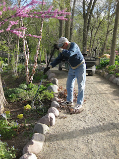 verything down but we've learned some hard lessons in the past. To the right is Del tidying up in the woodland walk garden. With the plants filling in so quickly, we're accelerating our clean-up and mulching schedule as well! Dennis and Stan did a nice job composting two good sized garden beds along Palmer Drive. Dick H. ran some debris to the dump and was helping Larry with some projects as well. To the left are Jim (in blue) and Dave T., who (along with Bob A.) were installing new timber edging around the gazebo garden beds. The end result looked great and offers some nice crisp definition to that area. The previous edging was rotted and in need of this total replacement. The guys have plenty of projects on the near (and far)