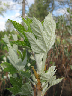 horizon! Dr. Gredler aerated the remainder of our lawns after Larry located/flagged the irrigation heads. Maury was in to run various errands and we also saw Shirley (weeding), Kris, Pat M. and many others. Karen M. and Lucas worked in the Japanese garden. Jenny was in later to continue gardening efforts in a couple different locations. Cindi was in to weed in the afternoon and Tom and Nancy F. helped organize many of our historic plans/designs. To the right is the emerging foliage of the oakleaf hydrangea (Hydrangea quercifolia) which has some nice silvery undersides to the leaves. While our oakleaf hydrangeas only bloom sporadically (summer), I like them for bold texture and a pretty reliable reddish maroon fall color (late October). Directly below is the chartreuse foliage of the 'Pistache' coral bell (Heuchera) which has a nice big leaf and is one of the "villosa hybrids" which are known for size, vigor and durability. Further down is the emerging orange-maroon foliage of the Coppertina ninebark (Physocarpus opulifolius 'Mindia') which is quite an eyecatcher with that interesting foliage coloration. It does maintain an orange tint thru the summer and gets a nice maroon-red fall color as well. This is my favorite of the ninebarks (at the moment!).