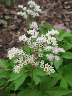 and is known for a clear white coloration. I think we have three varieties of white tulips out front and as usual, the color of our spring bulbs in that area segways in to the summer color selection. We're excited about our silver/white/light blue combinations and I think it will look quite nice. Tulips from previous plantings (yellow, red, etc.) occasionally pop up although Marianne is quick to snip those and put them in a vase. We do change over the tulips annually in this garden space. To the right are the bloom clusters of mukdenia (Mukdenia rossii or Aceriphyllum rossii) that is a coral bells (Heuchera) relative from China. We have these in shady locations and it's interesting to see the early bronze foliage (befor