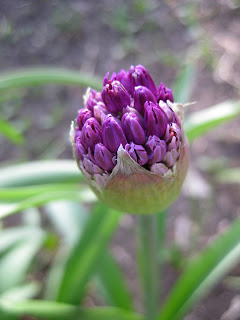 e bloom) and this perennial also gets a nice red fall color in October. The variety 'Crimson Fans' is the best for fall coloration. I didn't appreciate the flowers much until this spring. To the left is another nice example of the artistic oak leaves that continue to trickle in to the gardens. To the lower right is the start of an ornamental onion (Allium 'Purple Sensation') that is about six to seven weeks early. Granted, this specimen is in a "hot spot" with lots of sunshine and radiant heat but we typically don't see ornamental onions blooming like