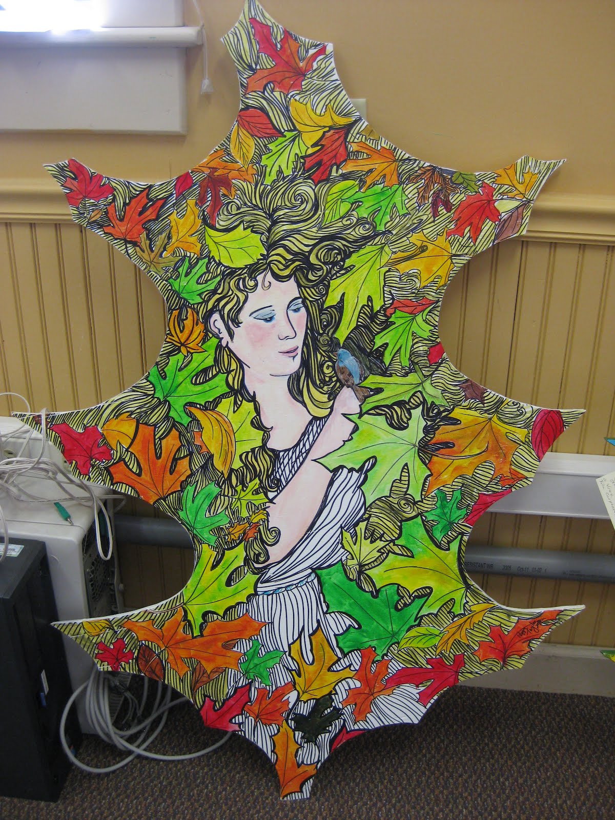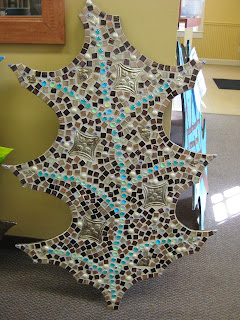 lot. To the left is the powder blue grape hyacinth (Muscari armeniacum 'Valerie Finnis') which offers such a nice color in the spring landscape. We have many clumps of this variety and that pastel blue is a nice spring component.I worked on many timely projects today that need to be addressed prior to my departure to the Netherlands next week. It's a busy time of year and I want to make sure everything runs smoothly without the grounds staff dealing with any "loose ends" that I leave behind. To the right is another of the oak leaf art projects. This one is very creative and will look beautiful out in the gardens. Directly below is one of the pallet planters and at the bottom is a shelf fungus on a large hackberry (Celtis occidentalis) near the Horticulture Center. I thought this looked neat and recall my younger daughter (years ago) explaining how these are used by fairies for shelter or might be the front porch for their homes inside the trees. Remember. All mushrooms are edible....some only once.