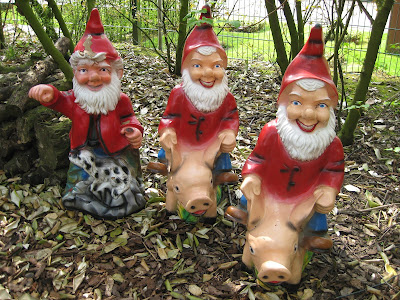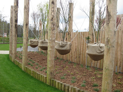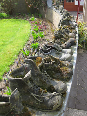 acerifolia) and a neat rain barrel that allows water to fill the inserted watering can first with overflow going in to that teardrop shape for later use. Further below is another planetree that was pruned to conform to that metal support system, old boots (with moss) along a wall at Apeltern (weird), rock-filled steel mesh "walls" that we saw everywhere with different "contents" (coconut shells in the next photo down) and some very scary gnome/dwarf creatures. I swear they blinked a couple times as I walked by and they will forever haunt my nightmares. I liked the hanging rubber totes with plants seen next followed by a huge pink trowel sculpture and some neat PVC tubes with daffodils (