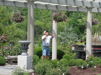The top photo of Terry watering hanging baskets today sums up a lot of our activity these past couple of days with our struggle to keep up with watering around the garde