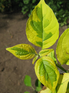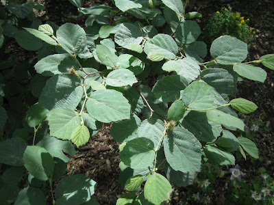 between composting, planting containers (including our 10 culvert pipe planters!) and watering. Pat spent the morning clearing more weeds and bulb foliage and he did a nice job composting two areas. Jenny worked in a couple areas for bulb clearing, helped hand water two large garden areas and later returned to some clearing duties. I was pleased with all the work accomplished today but can't help but think we'd have so much more "traditional" gardening time if we were weren't watering so much. I've never seen our May lawns get so dry as we usually count on decent rainfall. I hope this wont be a dry summer. To the right are the white bloom clusters of the native arrowwood viburnum (Viburnum dentatum) which has later interest with blue berry clusters (great for birds) and a nice red fall color. Directly below is one of the loads I hauled out this afternoon. That double layer cart is handy and all the plants seen there will be installed in the formal annual sections tomorrow as we should have a good turnout of "planters." At the bottom is the bluish foliage of the 'Blue Shadow' witch alder (Fothergilla x intermedia).