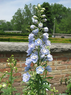 orial Children's Garden and moved over to the sunken garden to continue cutting back bulb foliage with Jenny. Maury ran some errands for us (gas run too, thanks!) and Dr. Gredler was in for some mowing. We also saw Chuck and many others today. To the left is a delphinium (Delphinium sp.) in the English cottage garden. Lynn, our assigned garden volunteer for that space, is including many of the old-fashioned perennials, annuals and vegetables in this garden and I think this will be this garden's most appealing year to date. To the right is the 'Nearly Wild' floribunda rose (Rosa) that is looking good in the formal French garden. This variety has a light fragrance and I've included it in my home garden as well for its toughness and flower power (single blossoms). In that same garden area is the Oso Easy Paprika rose (Rosa x 'ChewMayTime') glowing with orange blossoms. Further down is the powdery blue foliage of the 'Faded Jeans' spurge (Euphorbia pithyusa) that we'll be using in our white/silver/blue theme this year. I like the look of this foliage plant and we'll use it here and there.