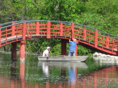 Neillia sinensis). This rare shrub is not overwhelming in any feature to be honest with the exception of being darn tough in the space where we located three of these (near the east gate). They get no supplemental irrigation, are in part shade and the soil is marginal. After the blooms are done, the arching form and clean foliage looks nice and eventually turns yellow in fall. We've never observed any insect or disease problems on these specimens either. At the bottom are Big John and Pat out in the boat. John has been painting on that bridge for the past week or two and it looks great! The new paint has really "brightened" it up.
