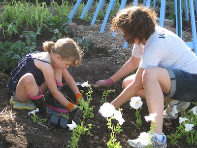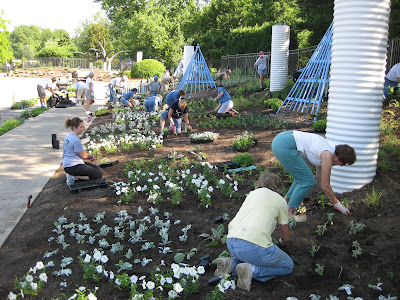 My blog title for today refers to the fact that we had well over 50 volunteers helping at the gardens today! We had a group of about 30 or so volunteers, pictured above and throughout this blog, that helped plant the front slope gardens in the entrance garden. A couple of our volunteers (Ron, Bev and Tina) were also here most of the morning but missed the photo op above. It was a very dedicated bunch. Included in this group were many of our veteran volunteers as well as some new volunteers as well. We had some Mercy Health System employees (see bottom photo) come in to help as part of their community involvement. Jumbo Jim also had three RECAP ladies that were quite helpful as well. Big John and Janice helped facilitate the day and we also had some help from Del with watering and hauling plants. Larry focused on running irrigation and watering containers prior to our afternoon of weddings. Dr. Gredler was in for some mowing and Bill O. came in to empty garbage containers and shear some more shrubs. The rest of our volunteers included over a dozen members of the Janesville Area Herb Society that spent some time this morning weeding and planting in the herb garden sections. What a productive morning!