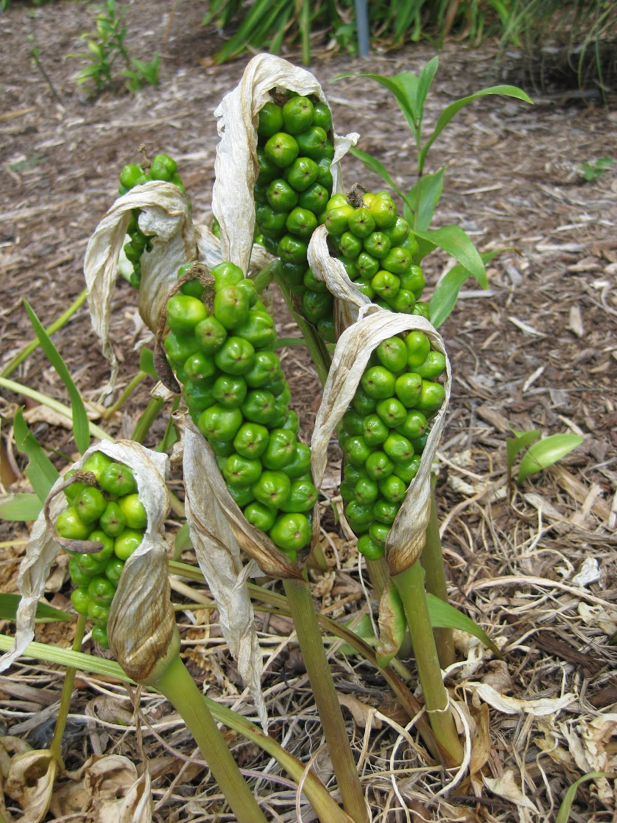 Arum italicum) to the left. Those fruit clusters will turn a bright orange and look quite similar to the native Jack-in-the-pulpits (