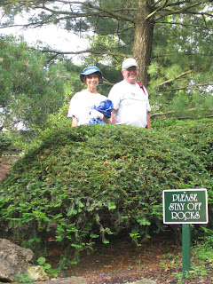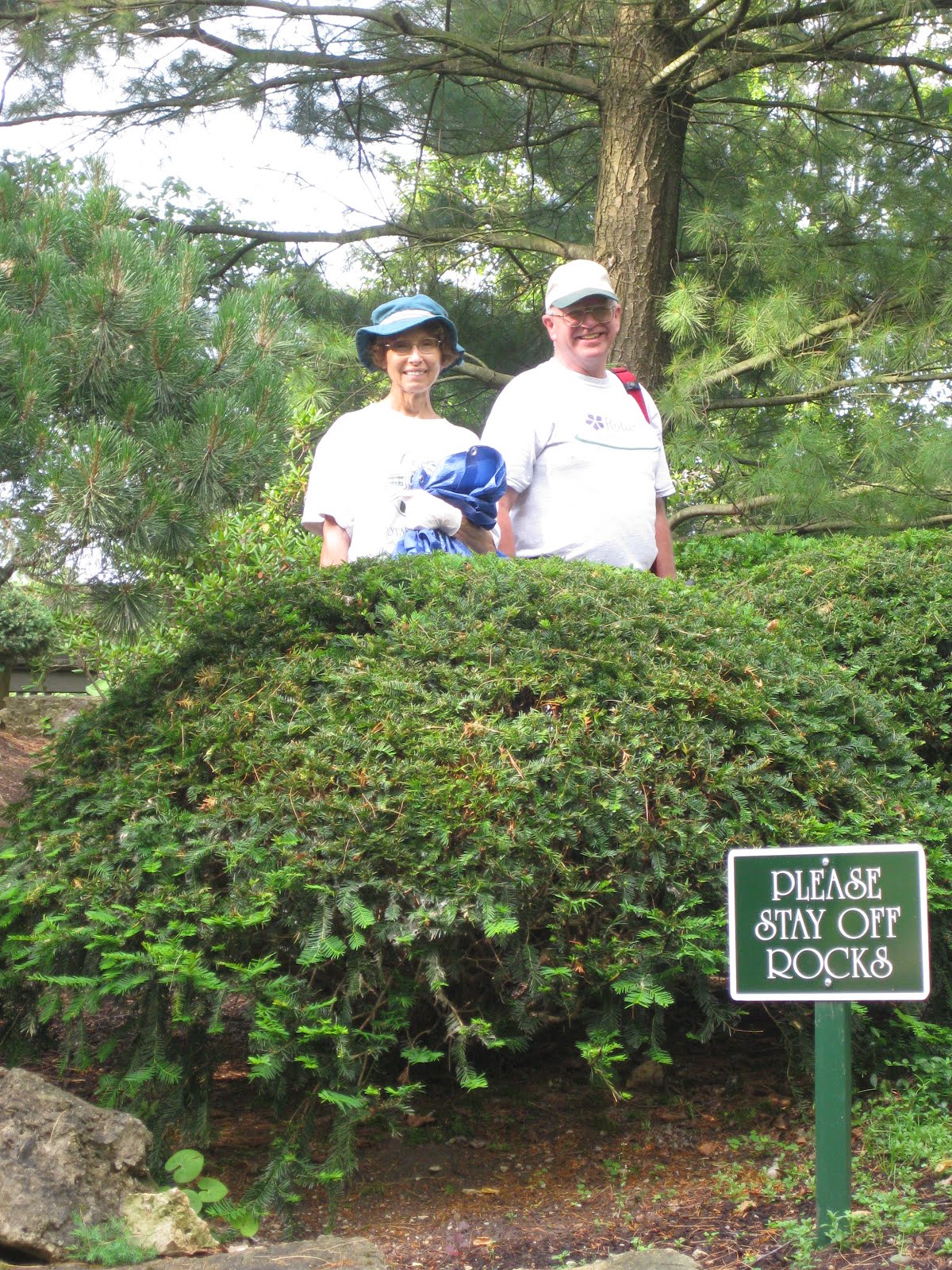 stions from visitors regarding their identification and the usual, "Where can I buy that?". We had a super group of volunteers today. Ron W and Russ jumped right in to hauling shredded bark up to the parking lot island. The guys did a nice job topressing that large space which we'll continue to monitor over the summer. With both islands relatively open now, we will continue to control weeds and consider additional plantings later in the summer / early fall. To the right are Karen M. and Stan consulting in the Japanese garden. These two volunteers, along with Jumbo Jim, maintain the vast majority of that popular garden. Bob C. an
