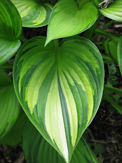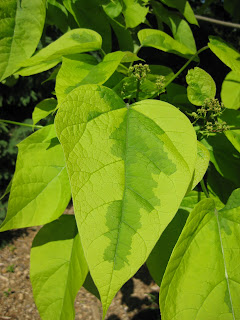 Dr. Yahr, Maury, Tony F., Londa F., Vern, Dick P. and many others. To the right is the yellow loosestrife (Lysimachia punctata) which has beautiful, long-lasting blooms but a tendency to spread rampantly. There are some other variegated forms that have additional foliage appeal but have the same wandering tendencies. To the left is the patterned foliage of the variegated Southern catalpa (Cata