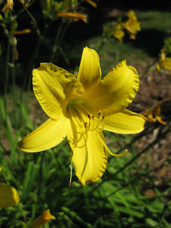 our entrance garden slope. This is our largest annual bed and we'll be planting about 8,000 annuals out there this Saturday (June 9th) as part of our Volunteer Planting Work Day (8 am until 12 noon). Pat did a nice job watering, collecting debris, push mowing and ultimately ended up painting the gazebo. Check out the classic shot at the bottom of the arched bridge (in the distance) framed by the gazebo. This is the most vivid both these structures will be (until they're repainted in a couple years)! Janice spent most of the day planting in the Ornamental Edible & Compact Vegetable Display. She also planted the second of two pallet planters (see below), weeded the new moss garden and did some watering. I hauled plants out to three areas in anticipation of more planting tomorrow and spent some time with a backpack sprayer of herbicide. One of my many loads of plants can be seen below. To the right is the 'Joy of Spring' daylily (Hemerocallis) which has been blooming now for a couple of weeks and is one of our first to bloom in our daylily collection. We have about 400 varieties around the gardens and are a National Display Garden for the American Hemerocallis (daylily) Society.