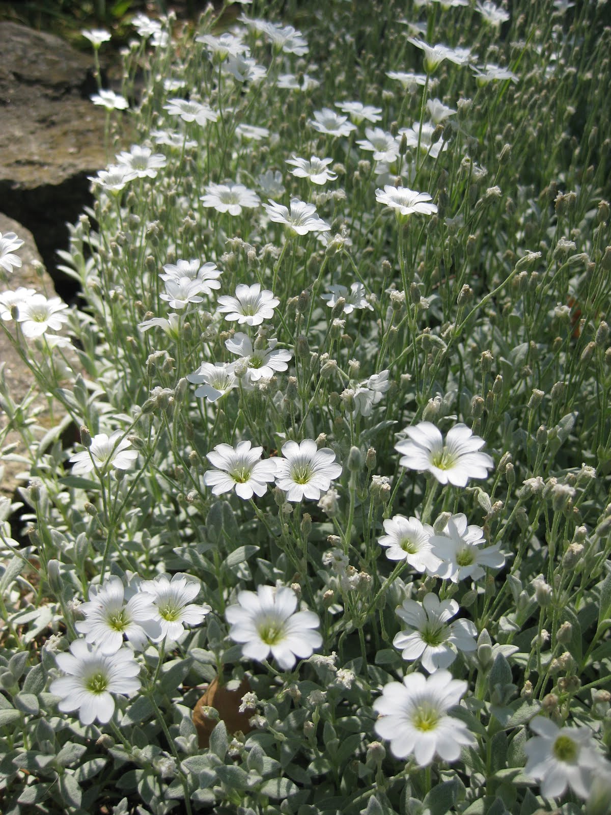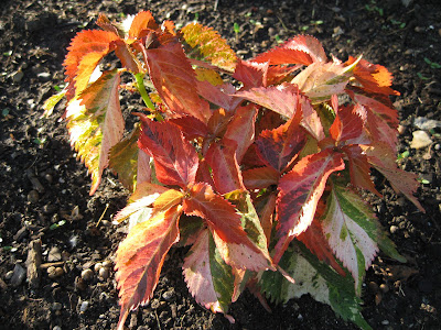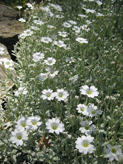 lpa bignonioides 'Variegata') which ultimately loses the variegation by July but is quite showy "in leaf" right now.We have a group of seventh graders coming tomorrow to plant and I hope they are motivated to accomplish some serious planting. In the past, some of these volunteer experiences have been tougher than others in terms of training and continued enthusiasm. We'll also have some of our traditional Wednesday volunteers coming in to plant so we're looking forward to continued progress with our planting momentum. To the right is the perennial snow-in-summer (Cerastium tomentosum) which is in the alpine section of our Scottish garden. Directly below is the showy foliage of the 'Peach Whirl' copperleaf (Acalypha wilkesiana) which is part of the new Tiki series. We've grown lots of different copperleaf varieties at the gardens and this one is one of the most striking (located in our orange border planting).