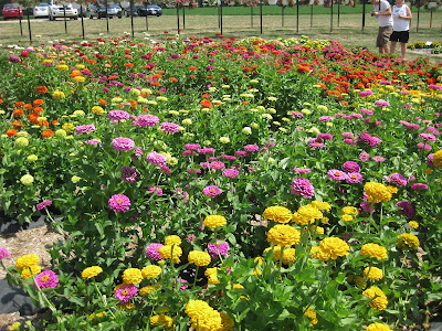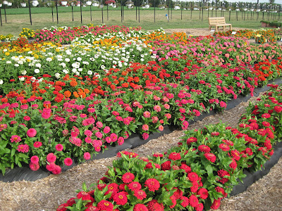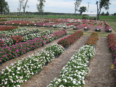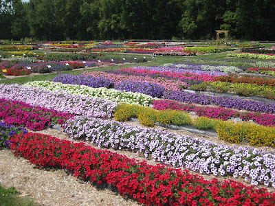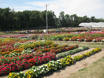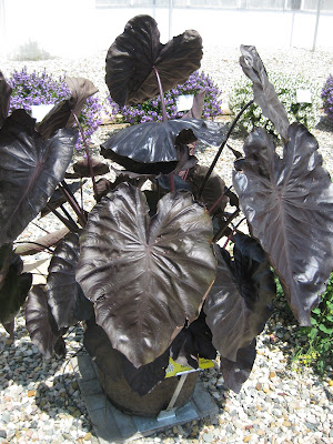 We then went mobile on the bus and had box lunches on the way to C. Raker & Sons Inc. nursery (Litchfield, MI). This nursery, founded in 1978, is the leading wholesale commercial supplier for plugs and liners in North America. They annually process more than 200 million plants (wow!). I was aware that Raker had a trial garden but I wasn't prepared for the SIZE! See the photos below. Needless to say, I wandered every square inch of the display and took many photos. I saw some neat varieties and a couple dozen plants I've never even heard of yet. I enjoyed seeing so many well-maintained plants like the 'Royal Hawaiian Black Coral' elephant ear (Colocasia hybrida) seen two photos down. They had various collections of varieties from different seed companies and their All-America Selections display and trial gardens were quite nice as well. They were a very hospitable company and provided dinner for our group. By chance, for dinner I ended up sitting with the Raker family (mom, dad, two daughters, etc.) and enjoyed chatting with everyone. It was a long day with two more nurseries and a botanic garden on the tour tomorrow (chance of rain, 50%).