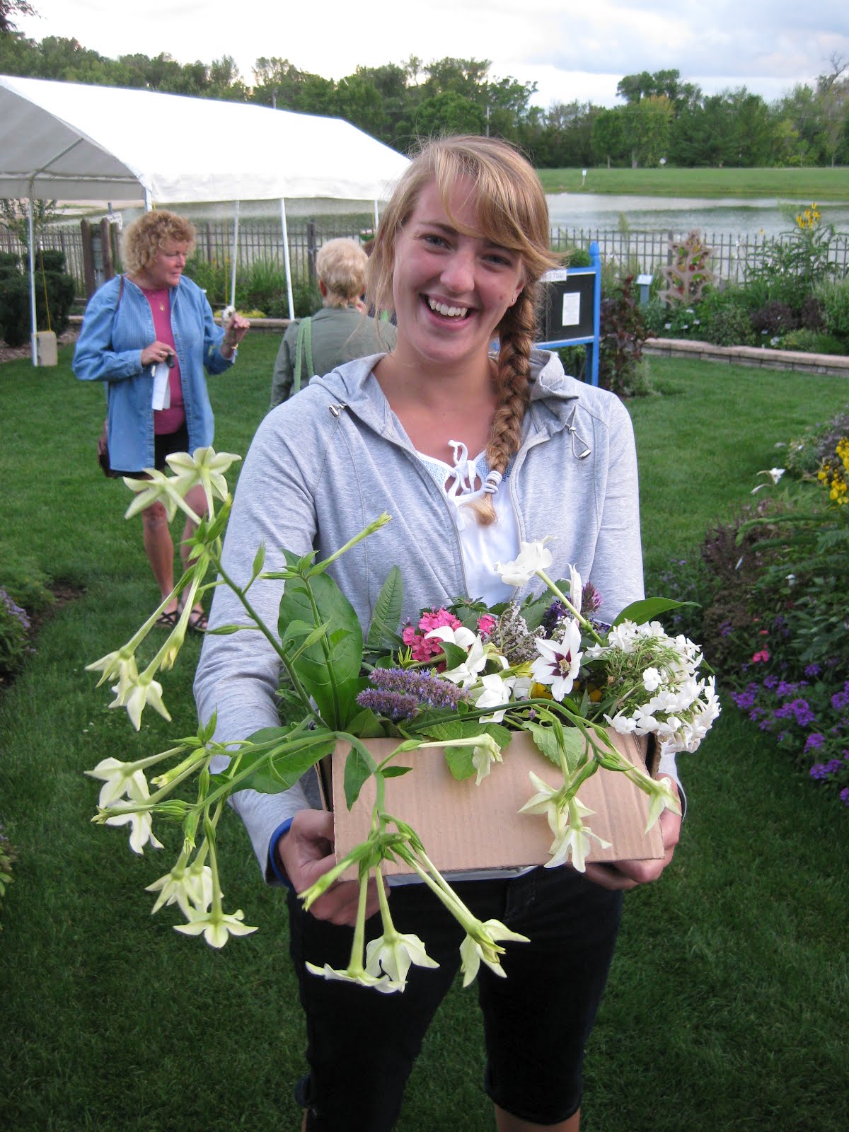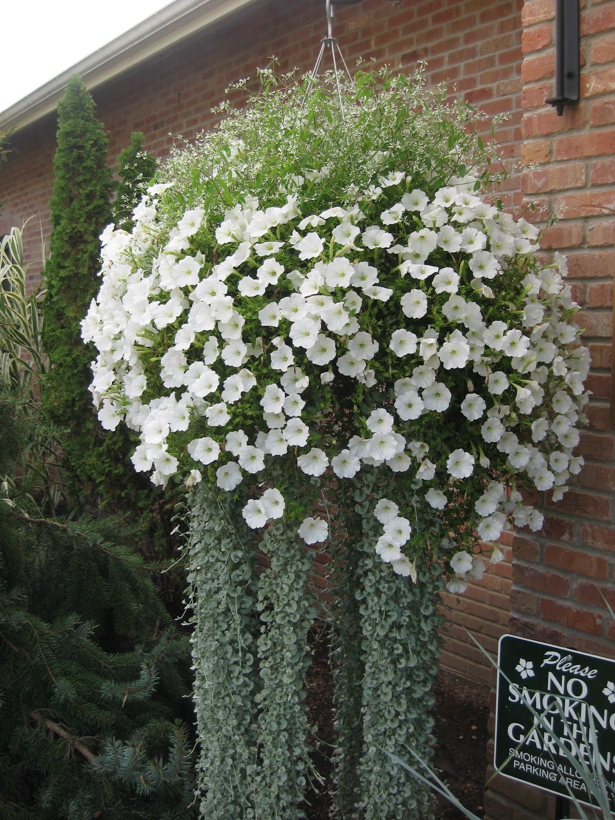 To the above left is our summer intern Sarah (student at St. Norbert College in DePere) who has been a huge help for Kris with education programs. She collected the samples from our fragrant garden walk last night and we'll sure miss her when she's gone. To the right is one of our hanging baskets in front of the Parker Education Center which certainly echoes our theme of white and silver. The dangling plant is the 'Silver Falls' aluminum plant (Dichondra argentea). Directly below is some produce I picked from my home container vegetables yesterday. Talk about "ornamental edibles"! At the bottom is one of our fabric containers that we're trialing. We've learned that sweet potatoes (Ipomoea batatas) in fabric containers are no match for a hungry woodchuck!!!