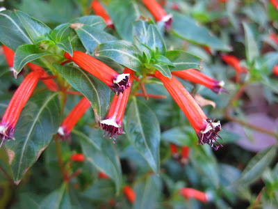 Plectranthus hybrida 'Plepalila') in the shade garden. Developed in South Africa, this plant is commonly used as a low-light houseplant but has application in the partly shaded garden due to the darker foliage and a very long bloom window (June thru frost) out in the garden. Below is the cigar flower (