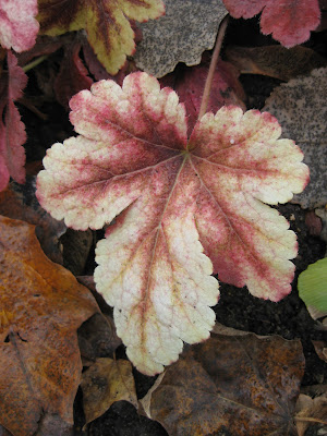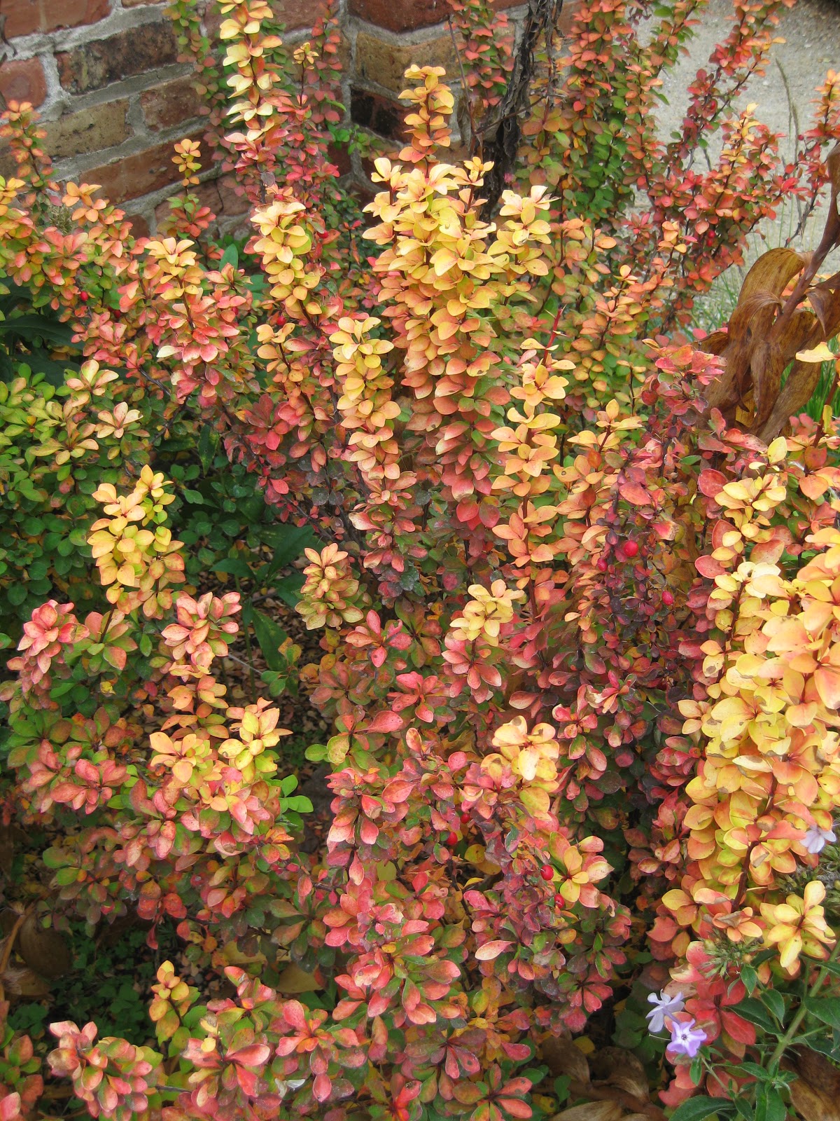 With our split weather today, the grounds staff has a perfect 50/50 day of outside work and then inside work during the damp afternoon. Marv and Terry organized, stacked and hauled three pallets of bricks that will be used shortly to widen a path that has long been in need of an upgrade (and width increase!). The guys also put up more lights out in the gardens and spent the afternoon testing/repairing lights. Marianne collected all the 1/2 gallon luminaries and lights used during the Halloween Walk and ultimately re-processed everything so it will be ready for use during the Holiday Lights Show (HLS). Marianne also devised and trialed a method for displaying lights from our "flying saucer" planters and it looked great. We'll follow her guidance getting the other ones prepared too! Marianne worked on HLS project inside as well. Larry helped collect and organize elements of the Halloween Walk and moved on to clearing plants and containers in the reception garden. He left early to sharpen our chainsaw blades at home so they're ready for our evergreen "tree procurement efforts" in the coming weeks. Big John also helped dismantle the Halloween Walk and spent the rest of the morning clearing seasonal plants from the entrance garden, one of our last gardens with annuals left to remove. He also worked on lights preparation and repair. I fertilized almost all of our lawns before the rain, had an afternoon meeting and am still finalizing some presentations. It was a great day with no shortage of either outdoor or indoor projects. It looks like a warm and damp week but we'll just roll with it. Directly below is the "orangey" fall color of the American smoketree (Cotinus obovatus) and beneath that, the ever-changing fall color of the 'Golden Zebra' foamy bells (xHeucherella) which is one of our more colorful foliage perennials from May thru November. At the bottom is the pinkish fall color of the 'Fenway Gold' Boston ivy (Parthenocissus tricuspidata). The foliage on this woody vine is a bright yellow in spring (as opposed to the standard green foliage) and the summer coloration is a chartreuse. I like this fall transition as well before the leaves drop (next week).