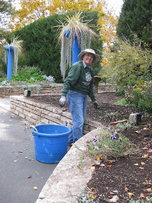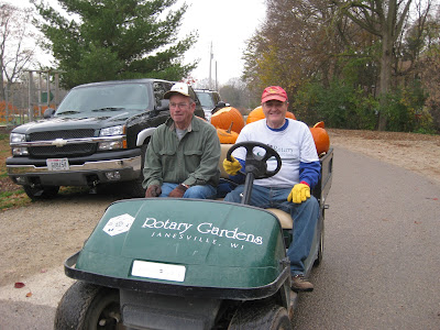 Mondays are always busy and today was no exception. We had a great volunteer turnout this morning. Ron W. and Larry H. ran out to pick up pumpkins for the education program and upon their return, they helped with taking down the Halloween Walk tents, hauling pumpkins, garden clean-up and some other tasks. Our team of Bob A., Rollie, Vern (all three seen directly below), Jim, Dave T. and Dick H. all worked on setting up the framework for our third donated greenhouse. They did a nice job and next week, we'll finalize securing these wonderful additions to the Horticulture Center facility and will get them covered for the winter. Dick H. also ran many loads of debris to the dump. An emphatic thank you to Tom & Kathy H. for their kind donation of the greenhouses which is much appreciated and they will be well used. Dick P. was out in the gardens installing new memorial bricks while Dr. Gredler did as much mowing and leaf collection as he could before the deluge arrived. Pat (second photo down) was part of the convoy involved with hauling back the Jack-o-lanterns from the Halloween Walk (went well this weekend) and he moved on to removing annuals from the entrance garden. The next photo down shows Eugene (left) and Bob C. also hauling pumpkins. The guys then moved on to leaf collection around the gardens. The next photo down shows Shirley who spent time in both the color rooms garden and reception garden removing annuals and cutting back perennials. Magda and Marleen (next photo) did a dynamite job clearing their berm, tidying up and planting bulbs this morning. They had no trouble generating some huge piles of debris later collected by the Grumpies. Gary S. worked on creating more labels and we saw many others today as well including Tom C. who is preparing for some helpful electric repairs/upgrades.