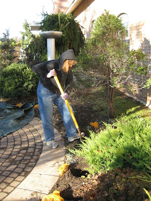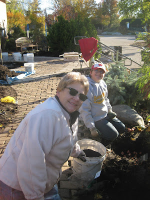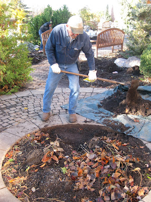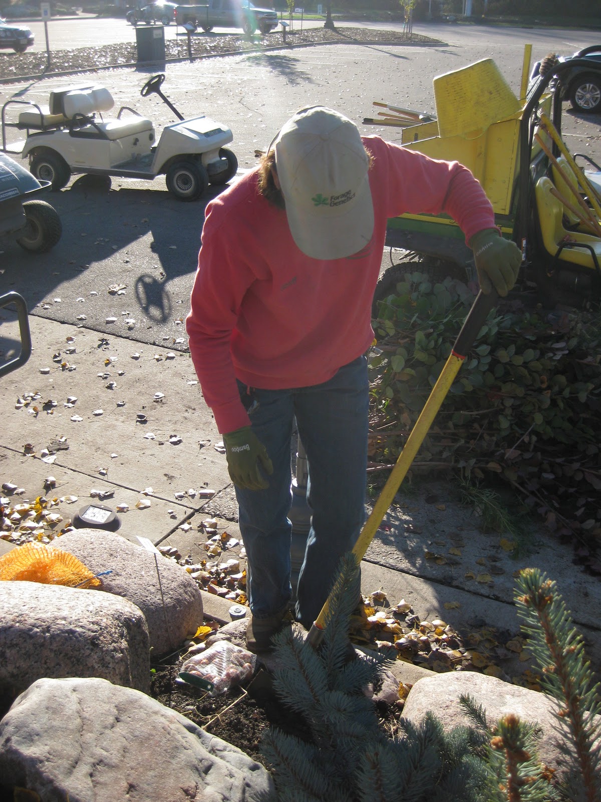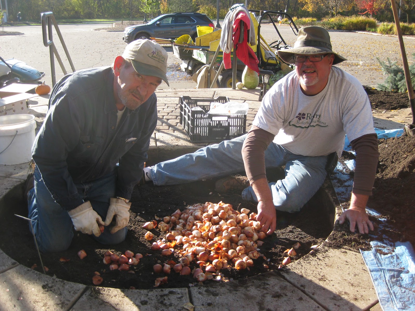 We had a very productive work day yesterday morning. The last of the season, we thankfully had great weather for this work session (8 am until 12 noon). While we didn't get as many volunteers as I had expected, we had just enough to get through our bulb planting goals for the morning. The gang planted over 3,600 bulbs in the entrance garden, North Point garden and English cottage garden. Above are Larry (left) and Big John planting one of the three center circles in the front entrance garden patios. We did a lot of digging in front of the building where most of our tulips (Tulipa) were planted. Directly below are Deb and Alex (grandson). Further down is Larry digging, Janice (in red) digging, Cheryl and Mary D. We also had help from Mike P., Maggie, Jumbo Jim and four RECAPPERS. The fourteen of us finished in time to get everything tidied up in the gardens where we planted. Jim and the RECAPPERS were also able to collect leaves in the Japanese garden and Bill O. was around to pick up trash and help collect leaves as well. We also saw Polly, Mark S. and Dr. Yahr. There also seemed to be quite a few visitors yesterday and some photography shoots as well. We're all looking forward to the spring results of our October labors! At the bottom is a picture that Janice captured yesterday morning. Great shot.