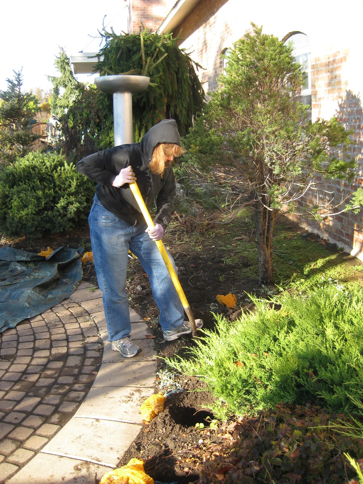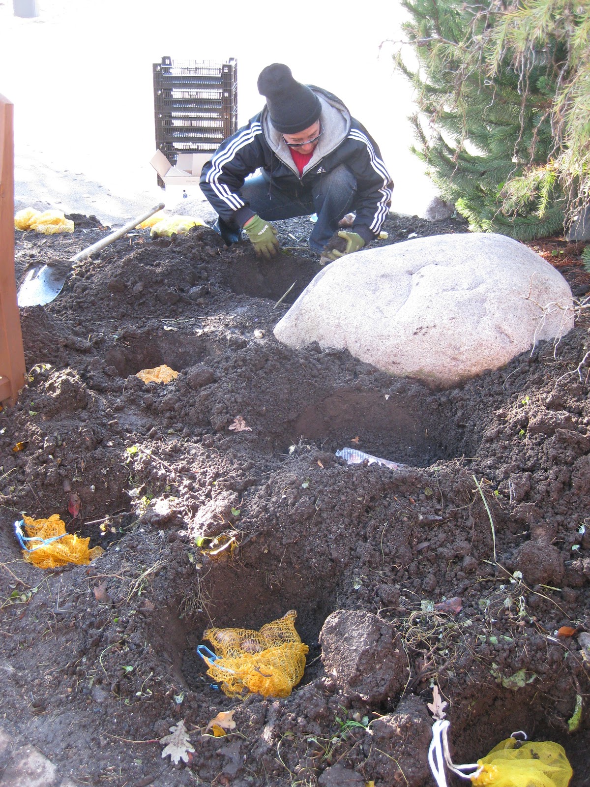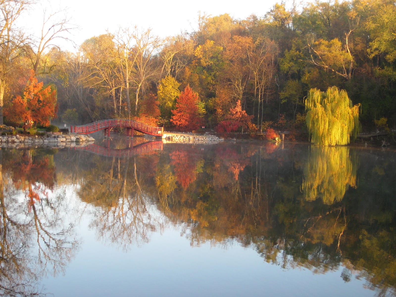 We had a very productive work day yesterday morning. The last of the season, we thankfully had great weather for this work session (8 am until 12 noon). While we didn't get as many volunteers as I had expected, we had just enough to get through our bulb planting goals for the morning. The gang planted over 3,600 bulbs in the entrance garden, North Point garden and English cottage garden. Above are Larry (left) and Big John planting one of the three center circles in the front entrance garden patios. We did a lot of digging in front of the building where most of our tulips (Tulipa) were planted. Directly below are Deb and Alex (grandson). Further down is Larry digging, Janice (in red) digging, Cheryl and Mary D. We also had help from Mike P., Maggie, Jumbo Jim and four RECAPPERS. The fourteen of us finished in time to get everything tidied up in the gardens where we planted. Jim and the RECAPPERS were also able to collect leaves in the Japanese garden and Bill O. was around to pick up trash and help collect leaves as well. We also saw Polly, Mark S. and Dr. Yahr. There also seemed to be quite a few visitors yesterday and some photography shoots as well. We're all looking forward to the spring results of our October labors! At the bottom is a picture that Janice captured yesterday morning. Great shot.
