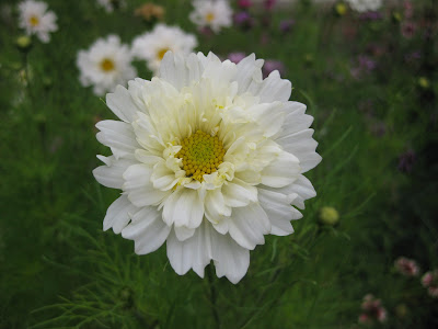 Today was another nice day with sunshine in the morning and some cloudiness and sporadic rain in the afternoon. We had a good 20 or so volunteers converge on the gardens this morning and it was a flurry of activity with lots of projects occuring all morning and throughout the afternoon. The top photo shows Hal and Doris in their assigned garden area on the Southeast corner of the gardens near our prairie restoration. Hal and Doris have done a great job in this space for 15+? years and were removing annuals today in advance of the weekend frost. Doris was doing most of the digging although Hal had the supervision covered well. Directly above is the showy cardoon (Cynara cardunculus). This specimen is in the terrace garden and is part of our white/silver/powder blue theme this year. I seem to take lots of pictures of this annual plant which I love for the showy silver foliage. This plant also has edible stems and is a close relative of artichoke. Occasionally it will send up a large, blue, "artichoke-like" blossom that is quite striking. This is one of our best specimens and I wanted to capture the beauty before frost works some "kung fu" on this plant shortly. Directly below are the increasingly red highlights on the 'Cheyenne Sky' switchgrass. This variety only gets about 36" tall and while it has some red highlights all summer, it's gets even more red as cooler weather approaches. I did a more lengthy blog on the colorful switchgrasses (Panicum virgatum) for Wisconsin Gardening Magazine at http://statebystategardening.com/state.php/wi/blog_01/panicums_for_fall_color/ recently. Incidentally, this is a great publication and very relevant to our area. The next photo down shows the 'First Snow' heath aster (Aster ericoides) in the terrace garden. The flowers on this Intrinsic Perennials (Hebron, IL) introduction are small but there are masses of them that create this impressive display.