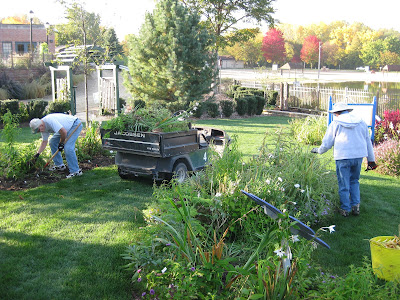 The volunteer turnout, as mentioned earlier, was impressive. We had lots of gardening volunteers but we also have volunteers with additional skills and talents. Directly below is Dick H. repairing the brakes on one of our RBG trucks. I just wanted a picture of the wheel assembly but Dick just had to get in the shot... He sure is a handy one to have around. The next photo down shows the guys starting to assemble our first of three small greenhouses. Our greenhouse assembly workers included Jim, Vern, Bob A., Dave T., Rollie, Ron W. and Ron Y. See further down for the greenhouse "re-construction" progress by 12 noon. Both Rons went mobile this morning to pick up donated plant benches that will likely be used in or around the new greenhouses. Bob C. and Eugene were out raking leaves around the gardens and it truly was a "shoveling in a snowstorm" type activity as the cottonwood (Populus deltoides) leaves were consistently floating down all day. Pat also collected leaves and Jumbo Jim had four RECAPPERS in the Japanese garden doing much of the same. Many loads of debris came back to our dump bin and growing compost pile. Del and Shirley (third photo down) did a nice job starting to purge annuals out of the Smelly Garden (Nancy Yahr Memorial Children's Garden). Mary R., Glenna, Amy, Karla, Marilyn and Suzie purged annuals in the All-America Selections garden and did a nice job tidying up the beds after they were cleared. Dr. Gredler mowed most of the day and Tom C. came in to repair an electrical issue in the sunken garden. We also saw Geesje, Dr. Yahr, Mary W., Lynn S., Dr. Steve, Tracy, Bev and many others. The fourth photo down is one of the many colorful truckloads of debris that went to the dump today. While we compost most of the plants we're pulling out this time of year (along with many leaves), we haul off the "thicker stemmed" items that would take longer in the compost pile.