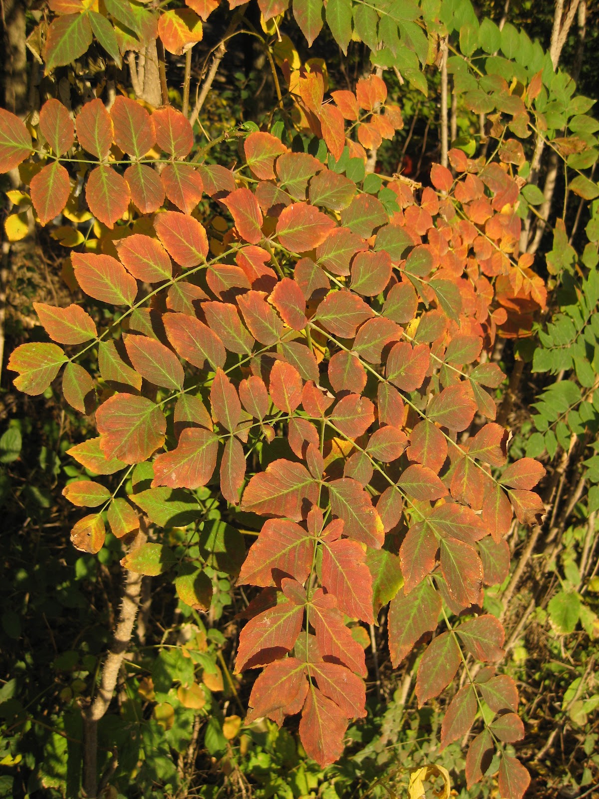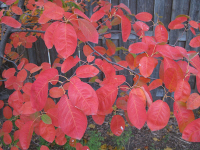 Today was a quiet day around the gardens although both staff and volunteers had plenty of work to accomplish prior to the weekend. The wedding tomorrow will be chilly but fall color is nice! It sounds like light frost this evening with a heavy frost overnight on Saturday. I've seen predictions of as low as 26 degrees F which should effectively finish off most of our annuals. This morning was brisk at 35 degrees F but it turned out to be a nice, cool, Autumn day and perfect temperatures for being outside. The fall color continues to be impressive albeit very brief this year. At the top is the always beautiful fall color on the Tiger Eyes sumac (Rhus typhina 'Bailtiger') which will continue to have more orange and red highlights over the next week or two. We have many of these around the periphery of the garden and they are staggered along our frontage road (Palmer Drive) for impact. I've had a half dozen people stop by in the past couple of weeks asking what that vivid shrub is out in the gardens. The photo directly above is the fall color of the Angelica tree (Aralia spinosa). This small tree has extremely spiny trunks, stems, etc. and does tend to colonize an area as a thicket. While it also has beautiful creamy white summer flowers, the wicked spines of this species have also helped garner the common names of Devil's walkingstick and Hercules' club. Directly below is another of the colorful, smaller switchgrasses (Panicum virgatum). This is the selection Ruby Ribbons ('RR1') which is out of the University of Connecticut. At only 36" tall, this variety is great for the mid-border and has reddish highlights all summer but the heaviest coloration is right now.