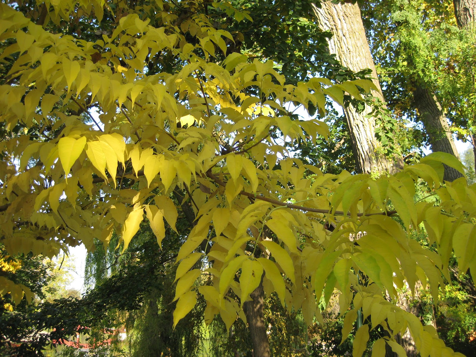 We had some nice volunteer efforts out in the gardens today. Kay was in early to start annual removals in the shade garden. With so many impatiens and begonias in this area, it was prudent to remove them before this chilly weekend as they will be mush next week. Kay filled many cart loads with debris, tidied up and shifted over to finish another area near the zig-zag bridge. Ron K. came in accomplish more leaf collection in the woodland walk garden and he planted another 200 or so spring blooming bulbs for color. Again, the leaves seem to be dropping quickly which isn't a bad thing once we catch up with collecting them. Maury F. ran some errands for us and was here for some other tasks. Dick H. finished brake repairs on one of our trucks and made some runs to the dump for us. Mary W. was in to work in the herb garden with Elsa, Lois and Ellie. The ladies removed tender herbs and tidied all three sections of that garden. Bill O. swept up the garage and went out for leaf collection as well. Dr. Gredler was here for a good portion of the day accomplishing his Friday mower rounds. We also saw Deb G., her sister & two grandsons, Dr. Yahr, Jim W. and many others. Directly below are the seed heads of okra (Abelmoschus esculentus) which I've never observed in the past. These look neat and the fact that we couldn't even give okra away to most of our volunteers allowed me to see this stage of seed capsule formation! The next photo down is the late-blooming and vivid monkshood (Aconitum carmichaelii) which will take some light frost and typically remain blue thru most of October. At the bottom are the golden fall colors of the Eyestopper corktree (Phellodendron lavallei 'Longenecker') and the orange of the Juneberry or serviceberry (Amelanchier lamarckii) respectively. This serviceberry is one of many available species (and numerous varieties) although all of them get decent to awesome fall color.