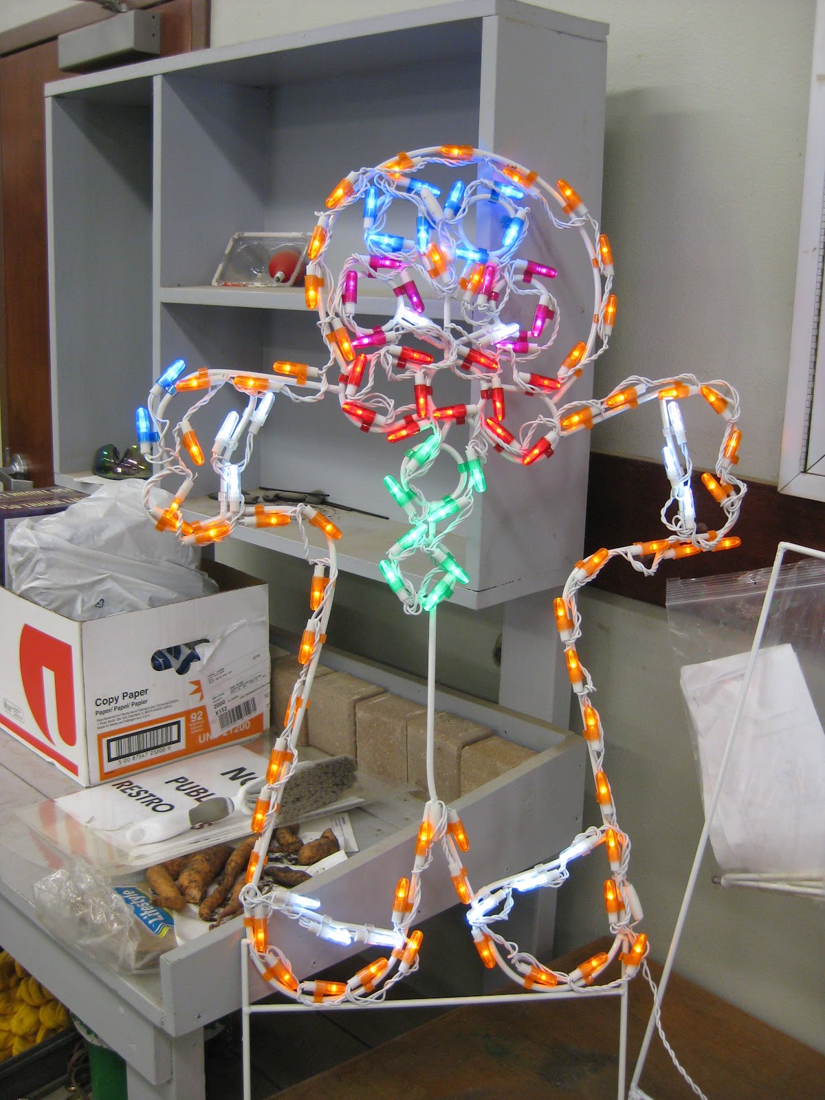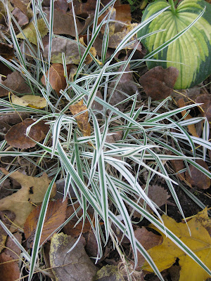 The grounds staff worked on myriad projects today. Marv and Terry started the day by unpacking some new holiday displays (see directly below) for the Holiday Lights Show (HLS). This gingerbread man is part of a more elaborate display but you'll just have to come to the HLS to see where it is featured! The HLS this year should be dynamite and I hope we have huge crowds and a nice, light layer of fluffy snow. This display is a sponsored piece from generous donors and we hope to have additional sponsored displays shortly. Next week we'll start sinking our teeth in to decorating out in the gardens and I'll get my cords ready to go. Marv did some nice work with the CASE endloader moving piles around, staging materials at the Horticulture Center and in general, doing some much needed organization of materials. He (and Terry) also brought back some of our larger containers from the gardens that have been emptied. Terry helped with these projects and also spent time emptying containers, push mowing and tidying up garden spaces. Big John was in this morning to continue his composting project along the recently removed orange wall planting. He also checked water features and continued removing annuals out in the gardens. We saw Pat briefly as well. I was out in the gardens this morning but spent most of my day catching up on desk work and planning for 2013. The second photo down shows the native Virginia creeper (Parthenocissus quinquefolia) at peak fall color up the trunk and branches of a cottonwood (Populus deltoides). I blogged about this vine earlier in the week and the specimen below is right across Palmer Drive from the gardens. Now is the time of year when the fall color reveals the location of these vigorous vines. The third photo down is the true Autumn crocus (Crocus sativus) which is an October bloomer for us. While we don't have many out in the gardens (marginally hardy), they are welcome when they do bloom. This species is the source of the precious spice, saffron. With the cooler temperatures in the garden, many of our "cool season" grasses are showing renewed growth. They were almost dormant this summer with the heat and drought but have bounced back in their more preferred season. This is the tuber oat grass (Arrhenatherum elatius) which has some nice variegation. My best shots of this grass at peak are early May and early October!