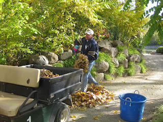 The volunteers had a full day today. The onset of cold temperatures and a healthy breeze today created plenty of raking opportunities for our volunteers (including Larry H. directly below). Bob C., Eugene, Lloyd and Larry brought back plenty of leaves and debris this morning and the leaves continue to flutter down! Ron W. picked up pumpkins this morning for our education program and he and Russ unloaded them at the main building for Kris and crew. Ron and Russ then went out to pick up donated benches for our new greenhouses and helped the other guys with greenhouse assembly. Jim, Bob A, Vern, Rollie, Ron Y. and Dick H. all worked on assembling the new (donated) greenhouse (see two photos down) and they got it up and ready. We'll pick up the other two later this week and early next week and will get all the benches situated as well. Gary cranked out more labels and is working on another labeling project as well. We also saw Mary W., Maury, Alice, Mark S., Terry's wife & grandkids and many others too. It was a productive day and while it remained cool in the afternoon, it wasn't totally unpleasant (as I type, looking out the window).