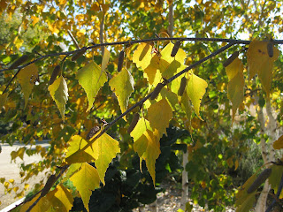 While we missed the hard frost that was predicted overnight on Saturday, we did have some crispness in the air this morning and most of our annuals will have to call it a year! All the work we did last week to remove tender annuals before the frost was well worth it as we're now looking at another good week or two of removals to catch up on shortly. Despite the cold touch of Mother Nature today, the gardens are still beautiful and the fall colors are still outstanding. The leaves are dropping quickly though! The top photo shows a look in to the Japanese garden from the formal gardens this morning. The second photo up shows the yellow fall color of our 'Whitespire Senior' gray birches (Betula populifolia) near the North point garden which usually have a consistent yellow coloration. Directly above, look closely, is an elephant ear that I had to cut down due to frost damage. Note the chunk of ice to the mid-left of the shot! All the plant cells were iced over and crunchy when cut and that ice was between stalk layers.