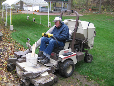 Despite the chilly, wet weather today, we had a decent turnout of volunteers. Below is Suzy, our lone Grumpette today. She worked with Urban (next photo down) and Pat in clearing one of our annual beds along Palmer Drive. Both Suzy and Urban (in these photos) are contending with digging out the annual feathertop grass (Pennisetum villosum) which rooted in quite nicely this year (to our volunteers dismay...). Incidentally, this is the second plant that I was told never to plant again unless I was prepared for a mass mutiny...The other was the annual aluminium plant (Dichondra argentea 'Silver Falls') which was quite vigorous and is hard to remove. Three photos down is Bob C. who worked with Eugene all morning. The guys helped haul pumpkins this morning and moved on to collecting leaves; a task that continues to offer job security for everyone! Ron W. also hauled pumpkins and was joined by one of his granddaughters later for leaf collection. Our mobile greenhouse dis-assembly team (Dave T., Jim, Bob A., Vern, Rollie, Dick H. and Dick P.) picked up the third of our three donated greenhouses today and will continue re-assembly next week. Dr. Gredler continued his mowing and leaf collection (fourth photo down) and we also saw Dr. Yahr, Dick C., Mary W., Kris K., Mary F.P. (Exec. Dir.) and many others. Bill O. came in later for some leaf clean-up and the Chestnut House volunteers were a big help this afternoon and prepared and placed candles in all of our Jack-o-lanterns during a steady drizzle.