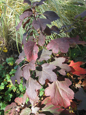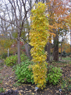 Big John and Larry headed over to the Rock County Farm early this morning and picked up our trailer loaded with carved pumpkins that Jumbo Jim and the RECAPPERS worked on yesterday afternoon (thanks Jim!). There were some really neat ones in the batch and all of our pumpkins really looked good out in the gardens. Larry worked with our irrigation contractor to flush out and winterize our water/irrigation lines around the gardens. Big John helped with lots of Halloween Walk work (hauling tables, pumpkins, chairs, etc.) and also retrieved, drained and stored all of our hoses that were still left out in the gardens. John eventually worked on Holiday Lights Show (HLS) duties in the afternoon. Janice put lights on obelisks out in the gardens, got Suzy going this morning, hauled pumpkins, worked with the Chestnut House volunteers and also repaired HLS lights. I worked on Halloween Walk duties throughout the day and had two meetings which took up some time. The two photos directly below feature the Slender Silhouette columnar sweet gum (Liquidambar styraciflua) at the edge of our shade garden. This upright element really shines this time of year although we rarely see reds and purples on this variety from the UK. Our other standard specimen has a wide range of fall colors and is one of our showiest deciduous trees for fall color. However, the yellows and oranges are nice on this variety and while this tree should be marginally hardy for us, it's done well over the past five seasons in this location. The third photo down shows the deep red fall color of a young Northern red oak (Quercus rubra) and at the bottom, our best specimen of the Korean maple (Acer pseudosieboldianum) along the west edge of the property. Hopefully the rain will hold off tomorrow night for the Halloween Walk although at least Saturday looks favorable. We also have a bulb planting work day this Saturday (Oct. 20th) which should be fun and productive (8 am - 12 noon!).