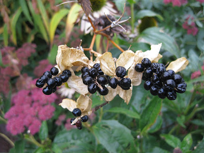While today was mostly cloudy, it was still nice working weather with the afternoon temperatures just over 70 degrees F. I was able to get out in the gardens a bit today although the desk work is piling up quickly with most of my "to do" list involving 2013 events and activities. The photo at the top is the native Virginia creeper vine (Parthenocissus quinquefolia) which can be seen throughout woodlands this time of year due to the nice red fall coloration. The color above is a dark wine-red although bright red and orange will frequently be represented with the best fall color in the sunniest locations. As the deciduous trees (particularly in woodlands) lose leaves, you may see bright red foliage up the trunk and branches of these defoliated trees. More often than not, that is the Virginia creeper. Directly above are the glossy black fruiting structures of the blackberry lily (Belamcanda chinensis) which are quite showy and nice in arrangements. This perennial had nice orange, speckled flowers in the summer and this fall fruiting display is an added bonus. Directly below is the variegated Japanese Joe-pye weed (Eupatorium fortunei 'Pink Frost') in the English cottage garden. That foliage looked nice before the flowers but this combination late in the season is quite dynamic. We've planted this variety in other locations as well for this showy contribution. The next photo down is the showy (and native!) bottle gentian (Gentiana andrewsii) in the fern & moss garden. This perennial prefers damper, organic soils in part shade and will typically start blooming in mid-September. However, this plant will also continue blooming until the hardest of frosts. Also called the closed gentian, this plant is obligately dependent on late season bumblebee populations to force their way in to the flower and accomplish pollination. We have a couple dozen specimens out in the gardens and they always elicit comments of approval from our visitors. That shade of blue is vivid this time of year. The third photo shows some of our ornamental kales (Brassica oleracea) called 'Glamour Red' that are just starting to offer some nice color as the days and nights become crisper. The extent and vividness of that pink will increase over the coming weeks.