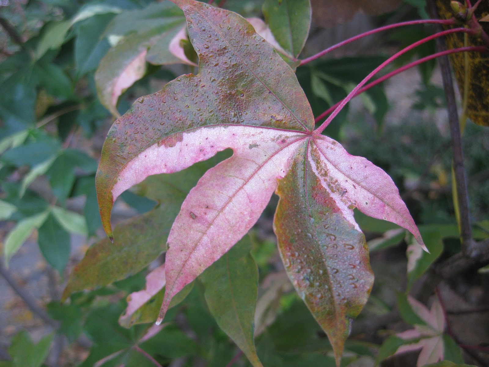 Directly below is the light yellow, almost white frond of the sensitive fern (Onoclea sensibilis) which is one of our native ferns. This fern gets its name because it is very sensitive to low temperatures which quickly turn the green foliage to a pastel yellow or gold. This process started a week ago with that light tinge of frost. This species loves wet locations and is common along waterways and in wetlands (it can spread!). The next photo down features the fall color of one of our fullmoon maples (Acer japonicum 'Aconitifolium'). We have three specimens of this maple and they all get "high impact" fall coloration. In Japan, this maple goes by the name 'Maiku jaku' which translates to "Dancing Peacock". This is one of our top 5 best trees out in the gardens for fall color. The next photo down shows the clear, golden fall color of the maidenhair tree (Ginkgo biloba) which is such a tough tree. Once all the leaves turn golden, they will usually drop within a day or so and come down quickly. The bottom photo shows one of our rarer maples in the Japanese garden. This is the variegated Shantung maple (Acer truncatum 'Akikaze Nishiki') which has been fun growing and observing. What you see as pink highlights were cream colored all year, lending the tree a "bicolor" look.