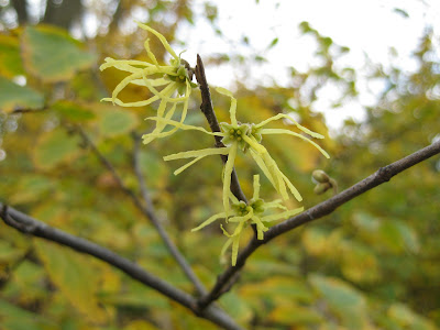 The grounds crew had a busy day. The rain held off the entire day until some sprinkles arrived around 3 pm or so. With a mild morning, everyone headed out for some gardening duties. This time of year, the grounds staff will split time between traditional gardening duties and Holiday Lights Show (HLS) preparations. Big John and Pat unloaded the pumpkins and staged them for the carving this morning. John then picked up tables for this activity and moved on to more clearing of annuals out in the entrance garden. Pat also removed plants, planted in the alpine garden and ultimately worked on lights repair/testing (as did John). Marianne worked on setting up luminaries for the Halloween Walk. Janice worked on this yesterday as well. Normally, the 1/2 gallon milk jug luminaries are used for the HLS but with inserted orange and red lights, these luminaries will look great for the event and will help with lighting/safety issues as well. Marianne also worked on clearing out annuals and perennials in the shade garden and put a nice dent in our HLS lights repair pile. Marv and Terry hauled back some of our empty garden containers for winter storage and spent a good portion of the day putting up lights in the formal gardens. The guys know the routine and are veteran decorators. I spent time working on Halloween Walk issues outside, hauled out plants, helped with the pumpkin project, etc. It was a nice day outside although it looks like it will be damp for a couple of days now. Hopefully we wont have rain during the Halloween Walk! Directly below is the fall color of one of our swamp white oaks (Quercus bicolor). The next photo down shows the start of witchhazel (Hamamelis virginiana) blooms. These blooms will go for another 3-4 weeks; well after the leaves fall off. The third photo down is a great example of interesting fall color on a herbaceous perennial. This is the variegated sundrops (Oenothera fruticosa 'Fruhlingsgold') which had nice yellow flowers throughout the spring but also nice yellow/green variegated foliage. The maroon only shows up late in the season. Another nice perennial for fall color can be seen at the bottom. This is one of our barrenwort (Epimedium x rubrum) specimens and while not all the leaves are this vivid, the overall fal color (mostly in November) is quite showy.