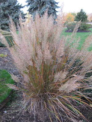 The rich, morning lighting was perfect today for photos and I took full advantage during a comprehensive tour of the gardens. Although we've had three light frosts, we haven't yet had the "hard one" which would have decimated most of the perennials as well. I was surprised to see the annuals in the reception garden still intact and quite a bit of color holding on here and there. The top photo is the fall color of the Korean maple (Acer pseudosieboldianum) in the arboretum. This small scale maple has superior oranges and reds and has proven hardy in our climate. This is one of our three specimens and all of them look great right now. I've been enjoying looking up thru various trees to enjoy the fall color and the lighting that comes thru the leaves. The photo directly above is the fall color of the bald cypress (Taxodium distichum). This deciduous conifer will lose these needles and regenerate them next year. Normally the fall foliage is a decent orange/brown but I caught this vivid orange (courtesy of the morning lighting) at the Horticulture Center. The photo directly below features the clear yellow fall color of one of our Japanese garden ginkgos (Ginkgo biloba). These leaves usually all fall on the same day. Oddly enough, I was in a doctor's office yesterday and there was a fall painting of a ginkgo with all sorts of leaf colors and even some that were dark orange or brown. The painting was nice but not accurate (I didn't point it out) as I've never seen a ginkgo look like that in fall! Amazing the things we notice.... The next photo down caught my eye and shows two plants I've blogged about in the past. The seedheads are from the 'Fatal Attraction' purple coneflower (Echinacea purpurea) which still have a hint of that deep magenta coloration. The horizontal seed heads of the 'Blonde Ambition' blue grama grass (Bouteloua gracilis) offer nice texture and this combo has been striking for the past three months and keeps on going! Speaking of cool grasses, note the Korean feather reed grass (Calamagrostis brachytricha) that has nice plumes and a tint of orange in the fall. This grass will tolerate moderate snows and can be a nice component in the winter garden as well. This is one of my top five favorite ornamental grasses for sure.