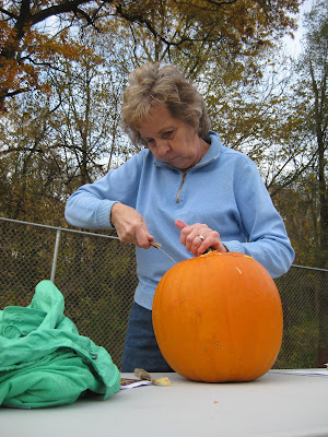 We had a great turnout of volunteers today, most of whom came to help carve pumpkins for the Halloween Walk which starts tomorrow night. See www.rotarybotanicalgardens.org for more information on this neat event. Directly below is Bev who was one of many expert Jack-o-lantern carvers today. The next two photos down show some of the action. Thanks to Bev, Margaret, Sue, Whitey, Leslie, Alice, Chris, Mary, Myrt and Nancy who collectively carved over 80 pumpkins this morning. Jumbo Jim was carving over 100 pumpkins at the Rock County Farm this afternoon with RECAPPER assistance. Out in the gardens, we had Kay (fourth photo down) cutting back perennials and collecting leaves out of her section of the shade garden. She hauled back many loads of debris and is one of our best volunteers for tidying areas with lots of obstacles (plants, signs, etc.). She has nice attention to detail. Dr. Gredler was in for more mowing and leaf collection around the gardens. We also saw Dr. Yahr, Kris K. and some others. We'll be setting all of the Jack-o-lanterns out tomorrow morning for the event. If it's rainy, we may have time to carve the remainder of the pumpkins which will be used as decoration regardless.