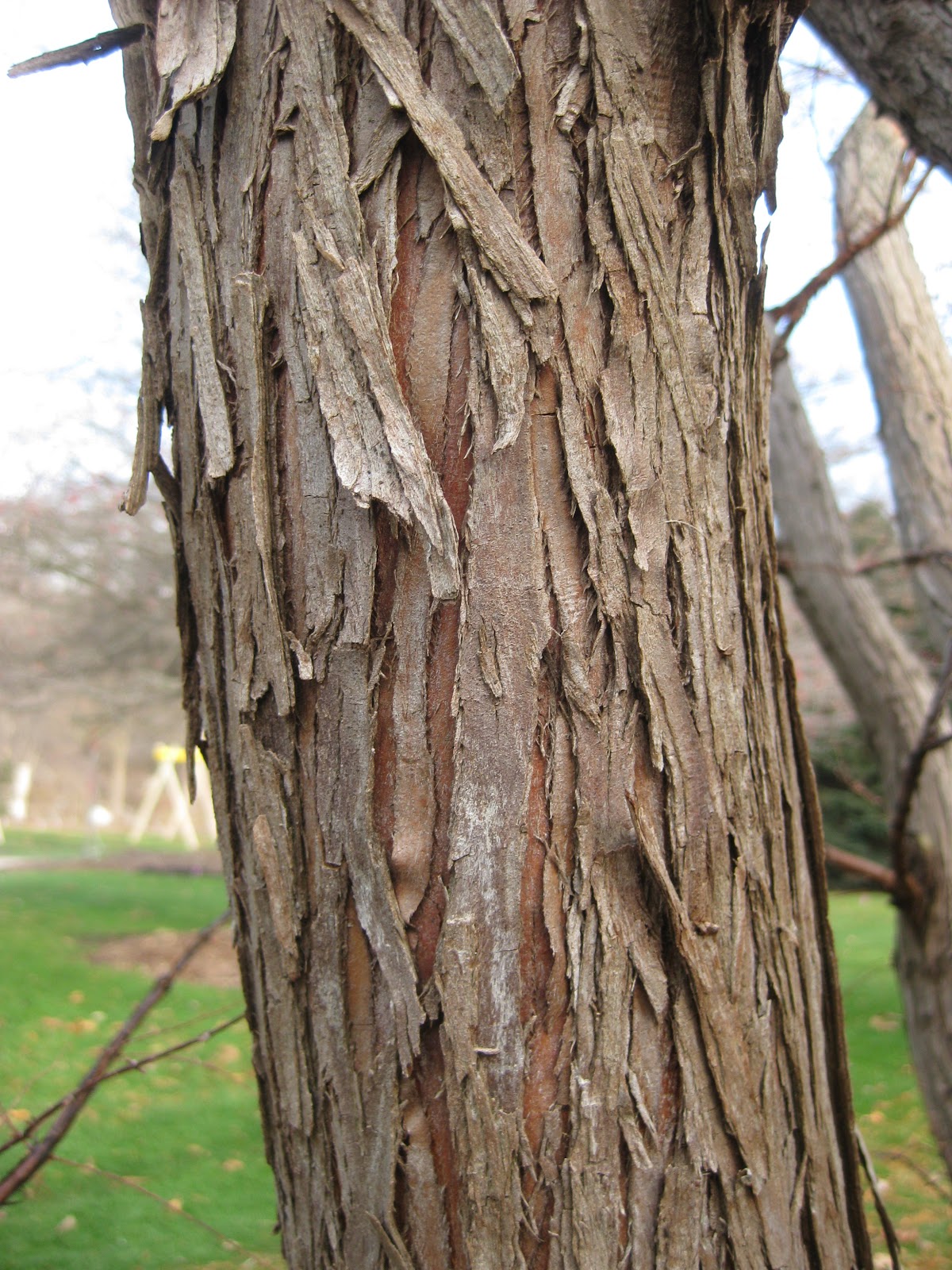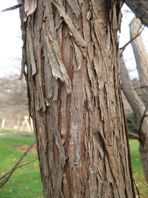 Today was another nice, sunny day with high temperatures approaching a comfortable 50 degrees F. It was perfect weather for some late season gardening as well as more Holiday Lights Show (HLS) preparations. Larry turned the entire HLS show on right away this morning so we were able to go around and see some immediate problems, tweak some areas and ultimately see which areas will be problematic. At least 80% of the show stayed on all day which is amazing. I'll make some adjustments tomorrow and I think we'll be in good shape for the test nights next week. At the top is our 'Cinnamon Snow' hellebore (Helleborus) budding out early. I think this plant thinks it's March! Those buds though are winter hardy and should be fine over the coming months. I'll keep an eye on this one. The bark directly above is from the dawn redwood (Metasequoia glyptostroboides) in the arboretum. I enjoy examining bark throughout the year but these winter months should also expose some neat bark characteristics in your own garden. Directly below is the golden Scotch moss (Sagina subulata 'Aurea') looking good in the fern & moss garden. Although not a "true" moss, this perennial groundcover has served us well in that space and offers some nice color (as well as little white flowers in early summer). The next photo down shows the foliage of the golden sweet flag (Acorus gramineus 'Golden Pheasant') in the Japanese garden. This grass-like perennial offers that golden texture throughout the growing season.