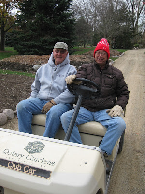 We had a good turnout of volunteers today that worked both inside and outside. Directly below are the carpenter Grumpies working on their new project. From left to right are Vern, Dave, Bob A. and Jim. The guys are figuring out how to best build a 20' tall obelisk for the gardens. Ultimately, we'll have more than one out in the gardens next year although this first construction may also find itself in the Holiday Lights Show (HLS)! The guys directly below also did some work associated with our three donated greenhouses. The next photo down shows Ron W. (in yellow) and Ron Y. hauling back our Adirondack chairs from the North Point garden. The guys also made many return trips with benches from the the gardens and I believe that between today's efforts and those on Monday, most of the benches are back at the Horticulture Center. Ron Y. also went out in to the gardens and brought back many loads of leaves from the sunken gWe'll be re-sanding and sealing all of these benches this winter for sure. The next photo down shows Rollie (left) and Dick (goofy red hat) who both worked on many tasks including helping John pound stakes for incoming HLS trees. Bob C. and Eugene K. headed out to the four rose crescents in the French formal garden and started skimming and removing our mulch of cocoa bean hulls which is replaced fresh each year. Stan was in later to tidy up in the Japanese garden while Bill O. also did some nice time. Maury helped Larry pick up some donated items and worked on myriad other projects relating to both of our buildings and some future upgrades. Dick H. ran a load to the dump and helped various people with various projects. Gary and Pat were in the Horticulture Center office preparing and creating more plant labels. We also saw Mary W., Kris K., Dean and many more today.