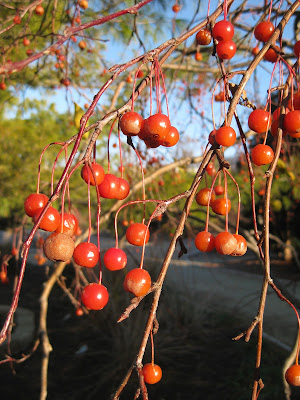 This morning was frosty but at least we had the sunshine right away. The day warmed up nicely to around 40 degrees F which was comfortable for working on more Holiday Lights Show (HLS) preparations. With most of the grounds crew (Marv, Marianne and Terry) finishing up at the end of the week, we're trying to get the entire show finished by Friday. Pat and Janice have already "officially" finished for the year although we'll see both of them here and there over the coming months. John will continue for another two weeks and then just Larry and I will be "on the clock" until April of 2013. We've had a great year and it's nice to find some closure with the HLS. Our testing nights are next week and all the problems should be corrected prior to Thanksgiving. The premiere lighting of this event is on November 30th as part of the Taste of Chocolate event (see our website). This event is usually sold out and this year will be no exception. Directly above are the showy fruits of the 'Red Peacock' crabapple (Malus) near the Smelly Garden. This one always has a nice quantity of glossy, persistent fruits that the birds will target later in the winter. Directly below are the stems of the 'Flame' hybrid willow (Salix hybrida) along our west embankment. These large shrubs were green-stemmed all spring and summer but the cool temperatures and direct sunlight really make these quite colorful. We hack these down to 12" in March to encourage fresh growth and a contained size of 7' or so for each plant. That fresh, vigorous growth is also the most colorful later that same year. The next photo down shows the colorful needles of the golden Virginia pine (Pinus virginiana 'Wate's Golden'). This specimen will become even more of a vivid golden yellow in the coming months and be a bright beacon until June of next year. The next photo down shows the late color of another of our perennial geraniums (Geranium sp.); this one out in the herb garden.