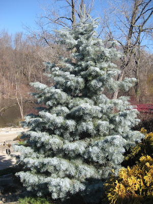 Directly below is the 'Blue Cloak' concolor fir (Abies concolor) that I can't stop photographing. The needles on this slow-growing conifer are 3" long and a beautiful powder blue. I never get tired of seeing this variety and appreciate the contribution it provides every day of the year. The next photo down shows one of the two bucket trucks from L.P. Tree Service that were here this morning helping with HLS tasks. That's John up in the bucket and he's a veteran at securing our "dangling icicle lights". Essentially, he's hooking the female end of a 100 count (50' long) strand of clear twinkle lights on horizontal branches that will allow the strands to dangle straight down. The guys lighly secure these in the larger trees with soft, aluminum wire that keeps them secure but allows us to pull them down in January. John and two other guys finished up this task and now we'll catch up with connecting power to all of these strands. The overall effect of having 250+ of these out in the gardens is quite amazing. We appreciate their efforts. The next photo down shows Whitey who helped John with decorating our recently obtained and secured spruce (Picea) trees with lights. Urban was out in the gardens pruning more crabapples (Malus sp.) and Stan did a nice job tidying up in the Japanese garden this afternoon. Pat was in to repair some lights and he also decorated some trees out in the gardens. Dr. Gredler helped process some new lights and was one of the attendees at our Garden Development & Maintenance Committee meeting (also included Maury, Hal, Gary, Joanne, Big John, Dick P., Christine R., Iza and me). Maury also ran some HLS errands for us this morning.